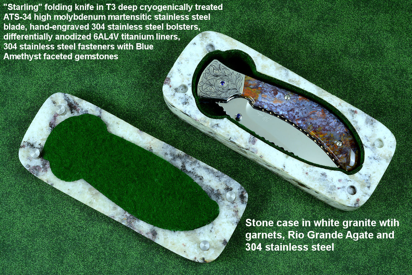 "Gemini" fine custom handmade knife in granite case. Knife is 440C high chromium stainless steel blade, hand-engraved 304 stainless steel bolsters, Confetti agate gemstone handle scales, anodized 6AL4V titanium liners