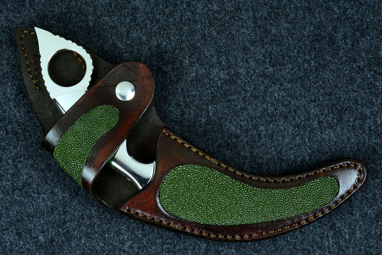 • Sheath: The sheath for a radically curved form like the Raptor is a challenge to create. I made this one in 9-10 oz. leather shoulder, and stitched it with heavy #346 nylon thread throughout including the wide belt loop. I inlaid the sheath with green rayskin, which is interlocking bone and very tough and durable. There are inlays in the front, the back, and in the belt loop. The dot snap is in marine-grade stainless steel for zero corrosion concerns. Because of the curve of the blade, the knife has to be "rolled" into the heavy welt-protective pocket following the curve of the spine. The sheath is sealed with saddle lacquer for longevity.