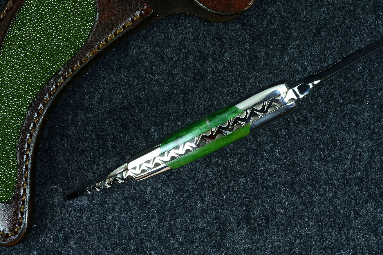 • The handle scales of this knife are a beautiful pair of Budstone scales from Barberton, Mumalanga Province, South Africa. This stone is also known as Verdite, or Buddstone, or even "South African Jade," but it is not a jade. Instead, it is a bright green and colorful chalcedony-based stone with abundant fuchsite-mica inclusions. This stone comes from the "greenstone belt" of the Barberton Makhonjwa Mountains, dating back 3.5 billion years. It's a tough rock, taking a silky, pearly luster and has fascinating inclusions of quartz and colored chalcedony throughout. This is an increasingly rare gemstone to find in pieces large enough for a knife handle.