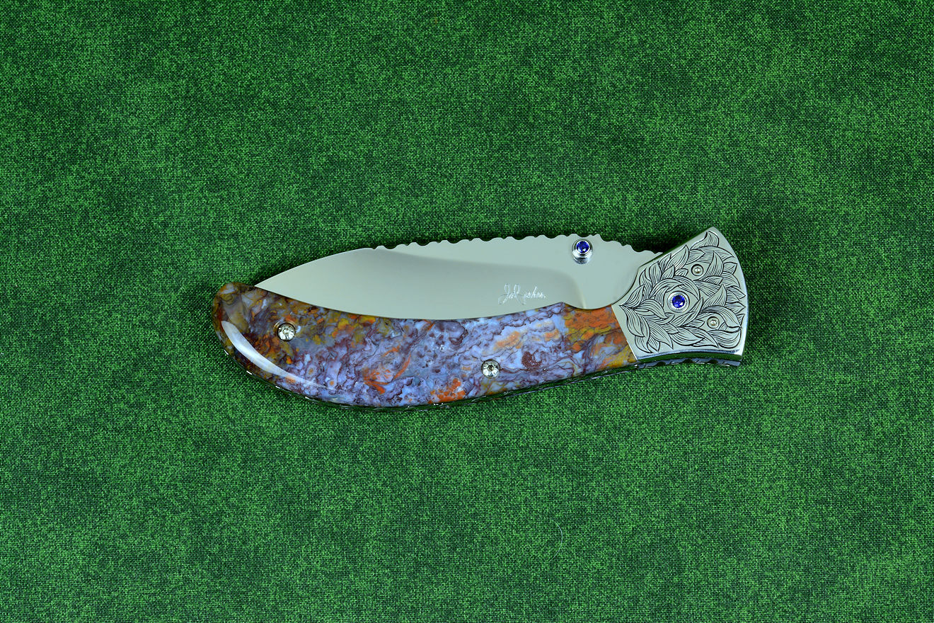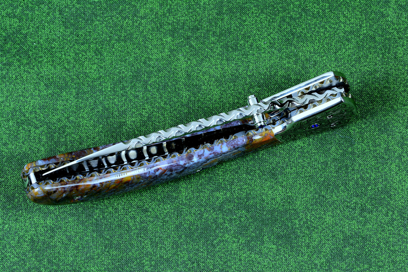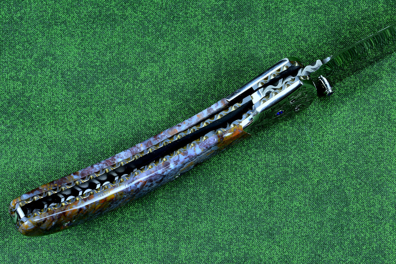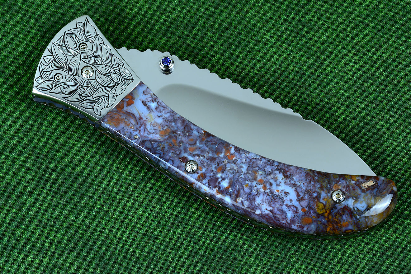 "Starling" fine handmade custom folding knife in T3 deep cryogenically treated ATS-34 high molybdenum martensitic stainless steel blade, hand-engraved 304 stainless steel bolsters, differentially anodized 6AL4V titanium liners, Rio Grande Agate gemstone handle, blue amethyst faceted gemstones set in 304 stainless steel fasteners and fittings