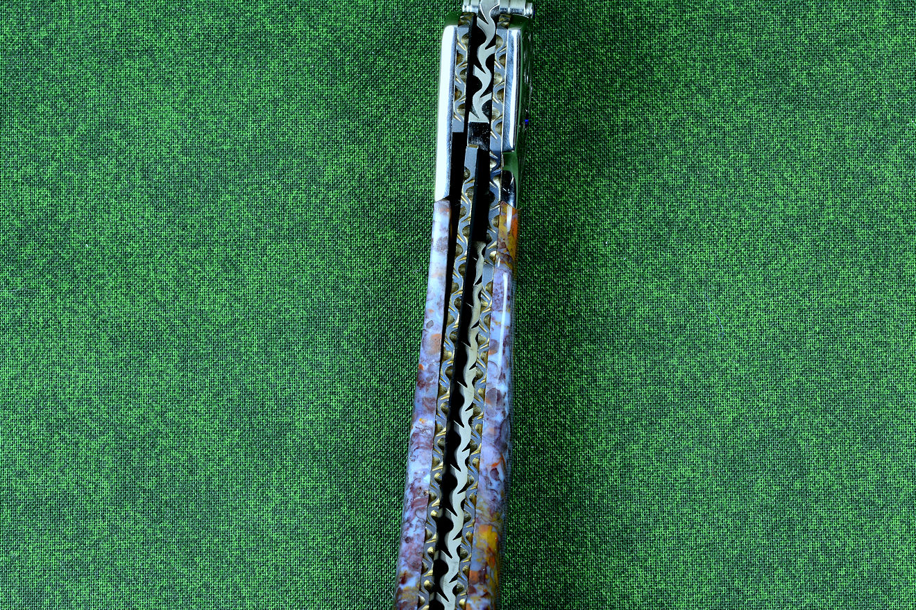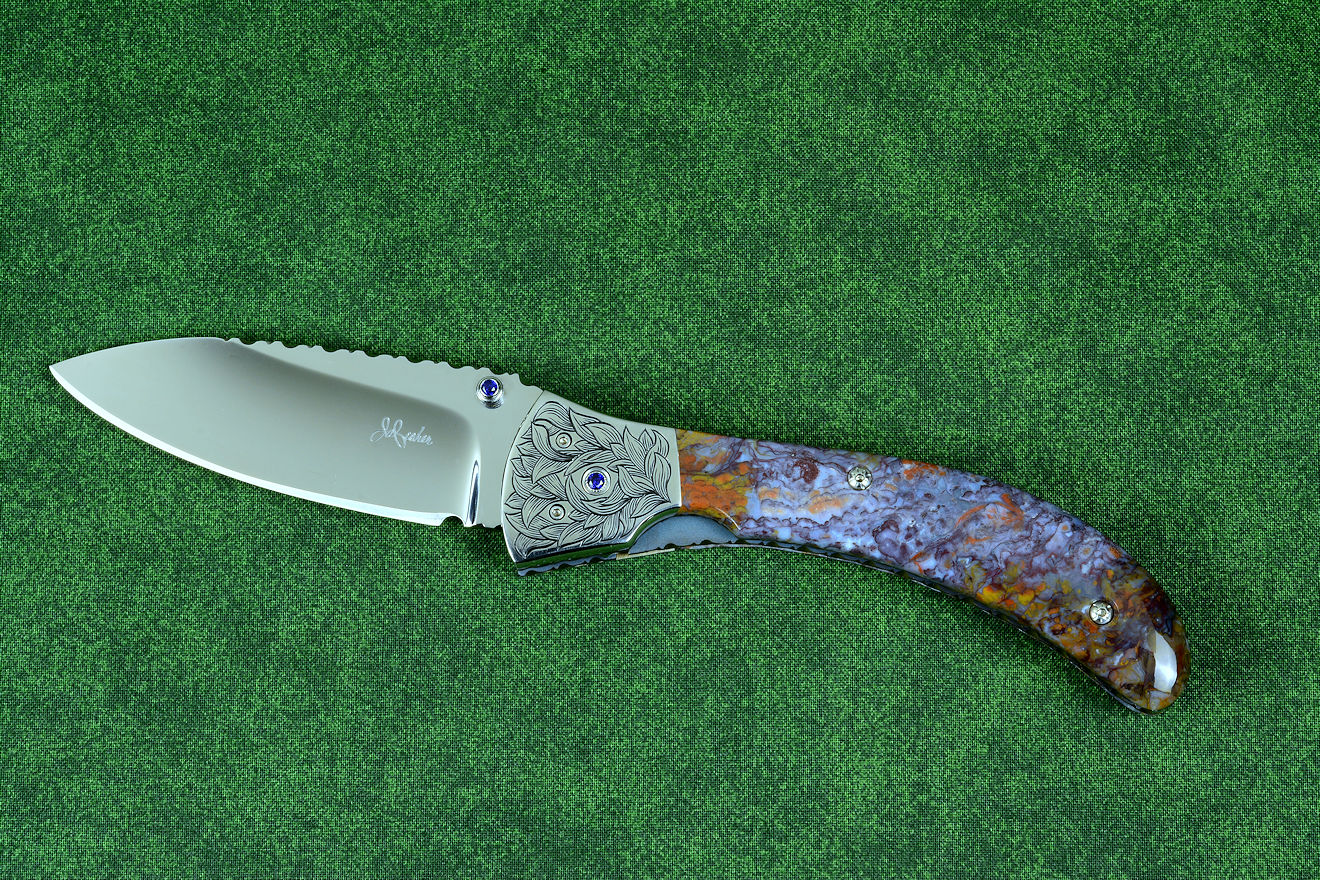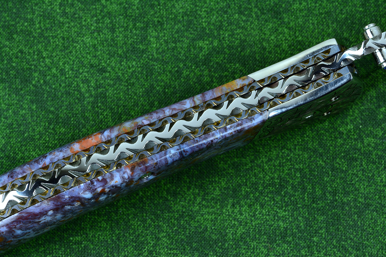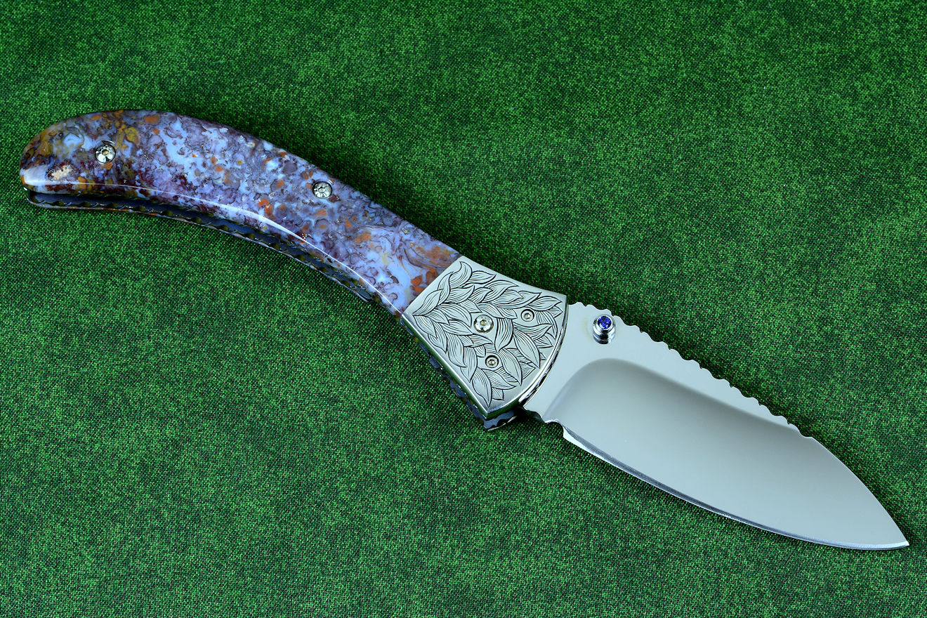 "Starling" fine handmade custom folding knife in T3 deep cryogenically treated ATS-34 high molybdenum martensitic stainless steel blade, hand-engraved 304 stainless steel bolsters, differentially anodized 6AL4V titanium liners, Rio Grande Agate gemstone handle, blue amethyst faceted gemstones set in 304 stainless steel fasteners and fittings