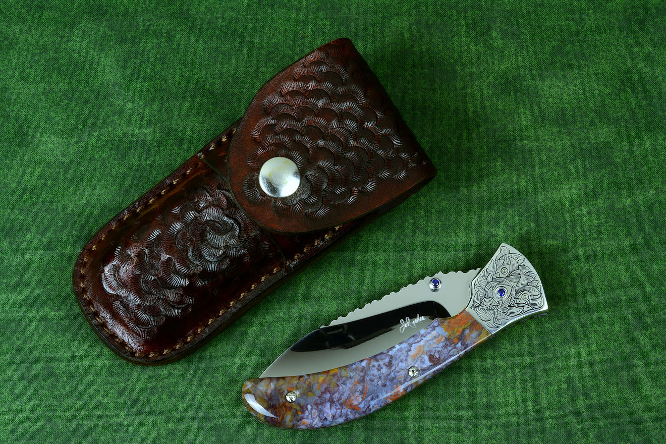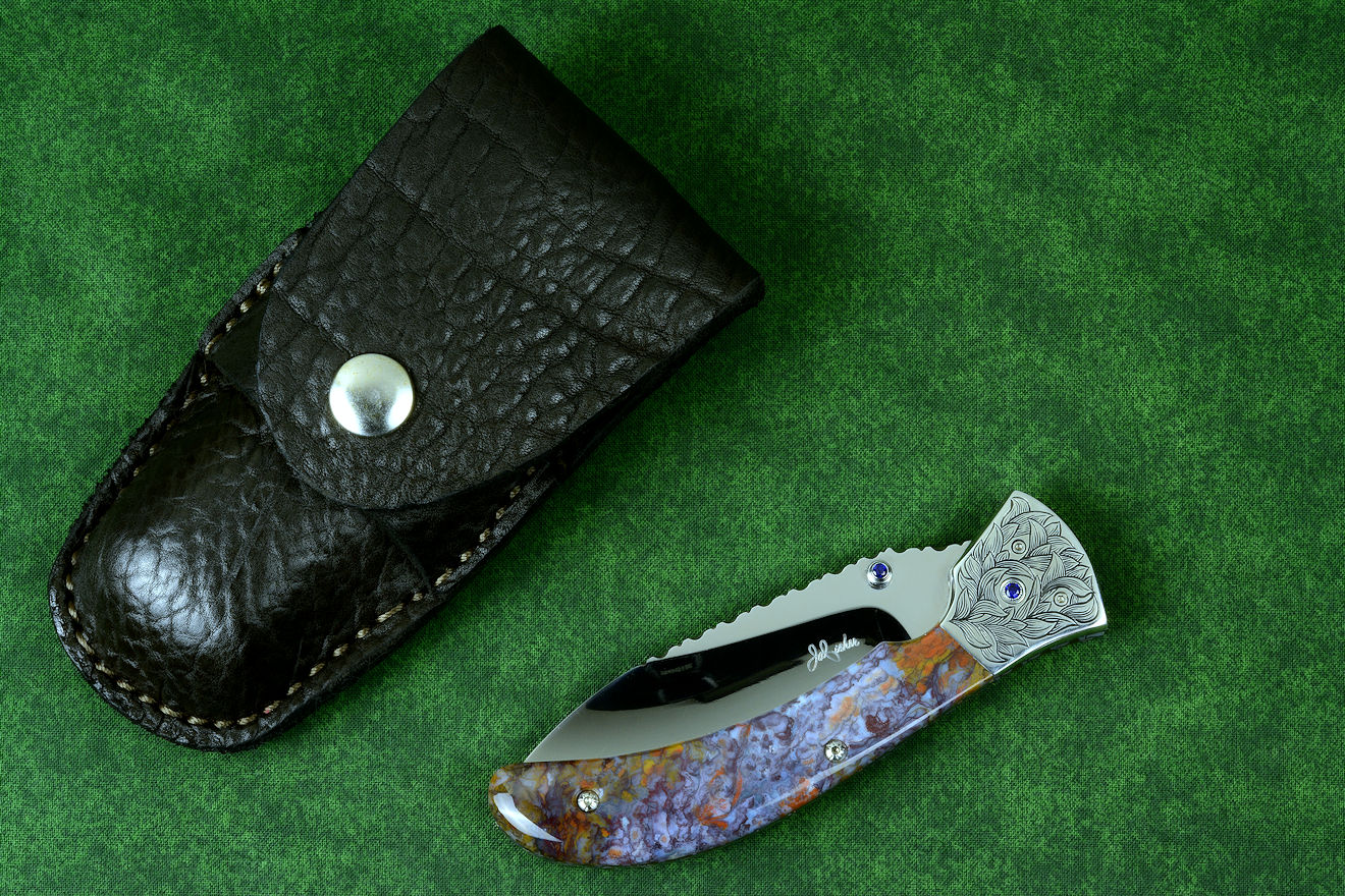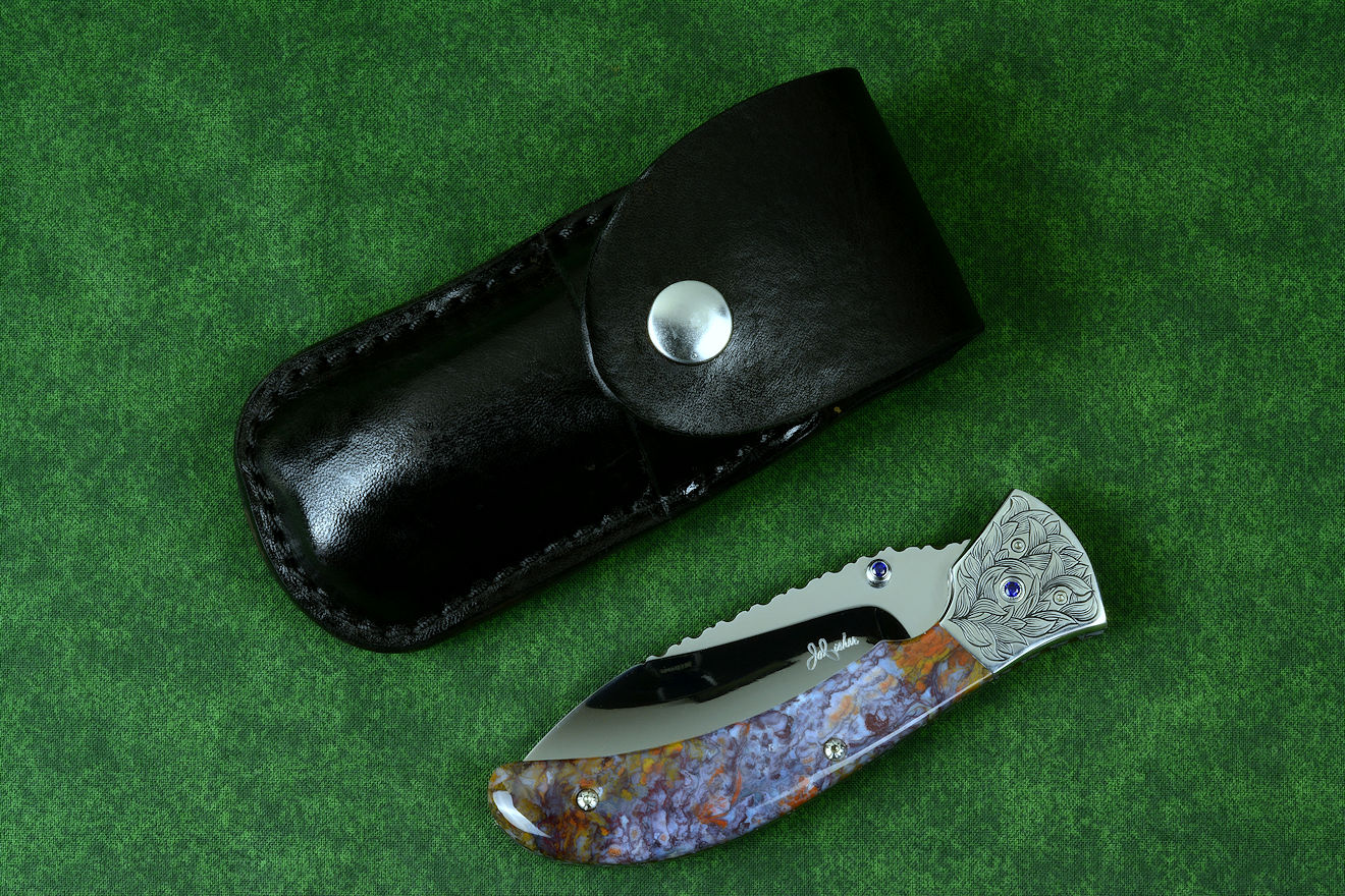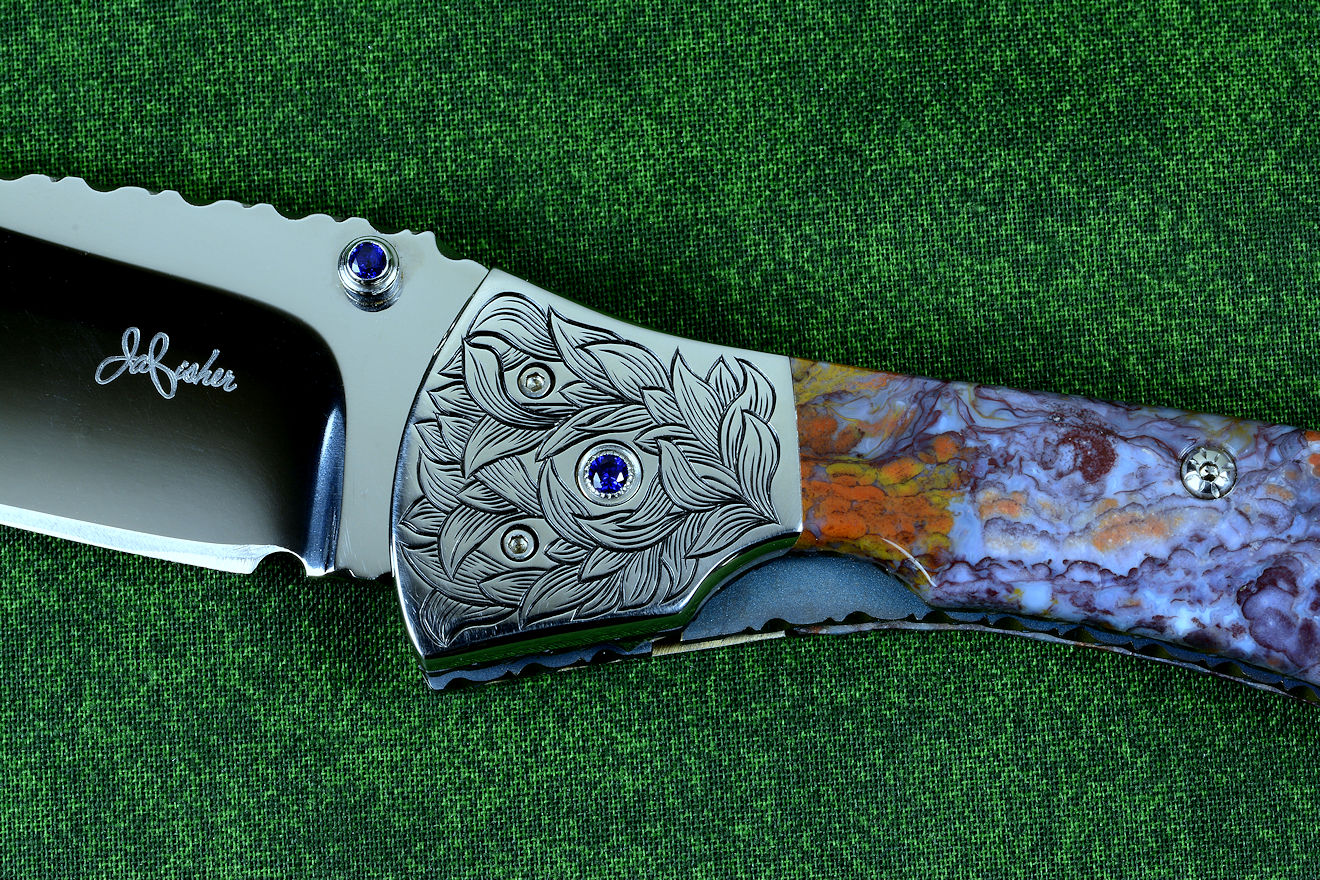 "Starling" fine handmade custom folding knife in T3 deep cryogenically treated ATS-34 high molybdenum martensitic stainless steel blade, hand-engraved 304 stainless steel bolsters, differentially anodized 6AL4V titanium liners, Rio Grande Agate gemstone handle, blue amethyst faceted gemstones set in 304 stainless steel fasteners and fittings