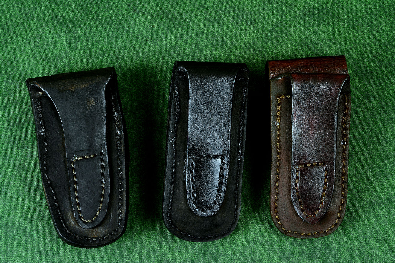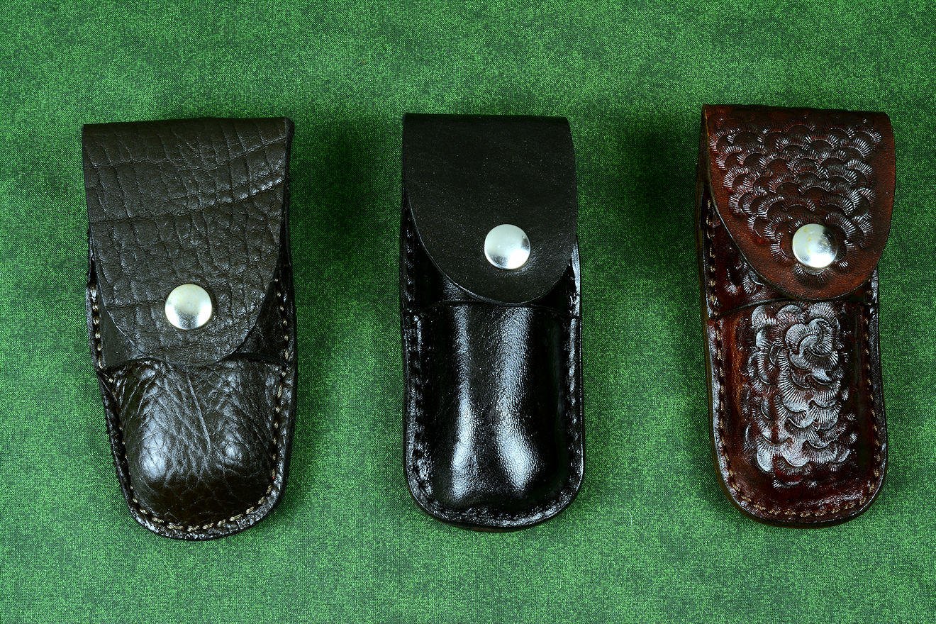 • Sheaths: I wanted to give my client a variety of wear options; it's better to have and not need than need and not have. I made these pocket sheaths with marine-grade stainless steel dot snaps and full coverage flaps for security. They should accommodate most standard belts. I included a durable and clean patent leather sheath for dress wear and simplicity, without being ostentatious. A heavier bold American Bison Skin (American Buffalo) makes a strong statement. I also added a camouflage-tooled pattern dark brown sheath for a lighter color tone. All of them are stitched with heavy #346 nylon thread and sealed with saddle lacquer for longevity.