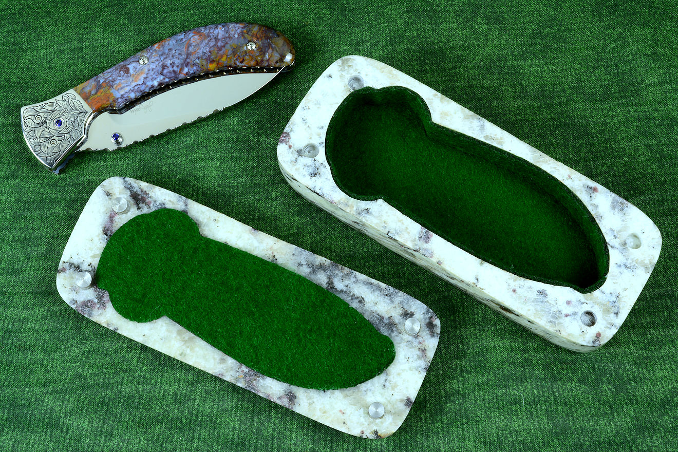"Starling" fine handmade custom folding knife, sheath roll, granite gemstone case