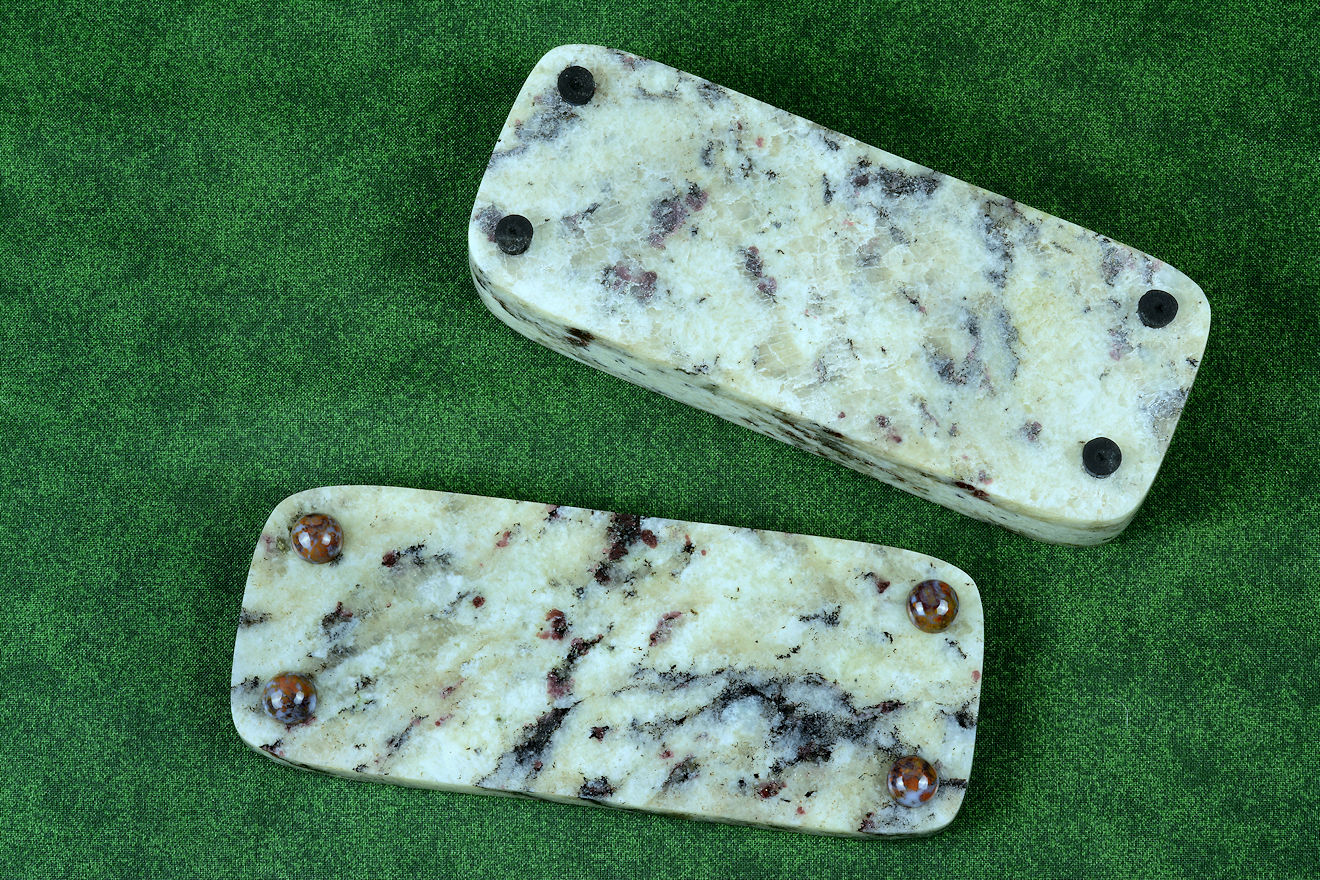 • Granite Case "Sarcophagus": This knife is so special, it deserves a protective, unique case as well as the roll, and I wanted my client to have every option.  I designed and made a stone case, sometimes called a sarcophagus, in white granite with ugrandite garnets. This is a material mined in Brazil, and is a hard, tough stone used in fine architecture. The name "garnet" comes from granatum which means "pomegranate." The deep red garnets are carried throughout the large feldspar phenocrysts of the granite and black hornblende. I made the case with stainless steel lid pins that assure proper lid alignment, and topped them with polished cabochons of the same Rio Grande Agate that I made the knife handle with. The bottom of the case has inset neoprene feet to prevent scratching, and the inside is lined with polyester felt for the same purpose.I think my client will appreciate this substantial granite case.