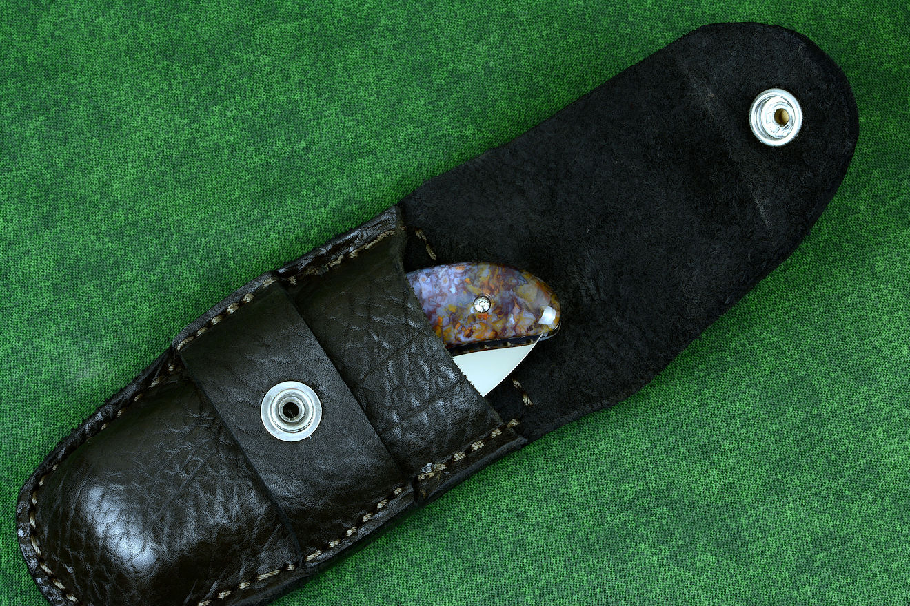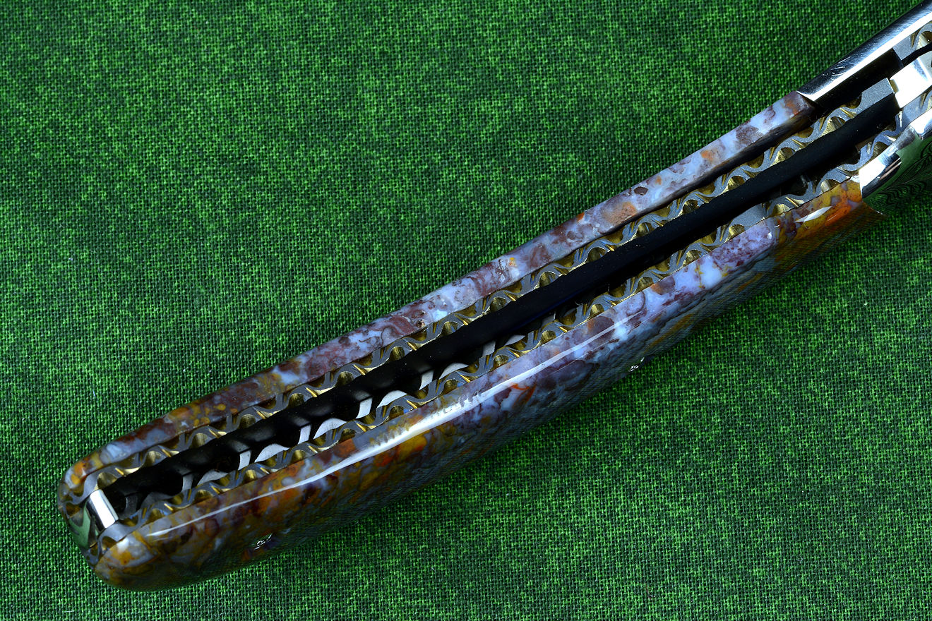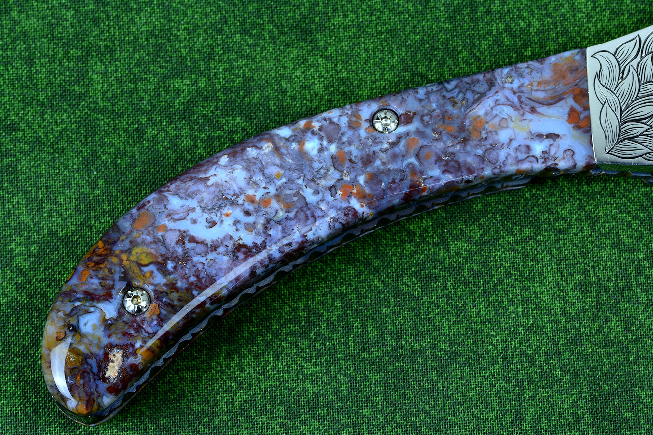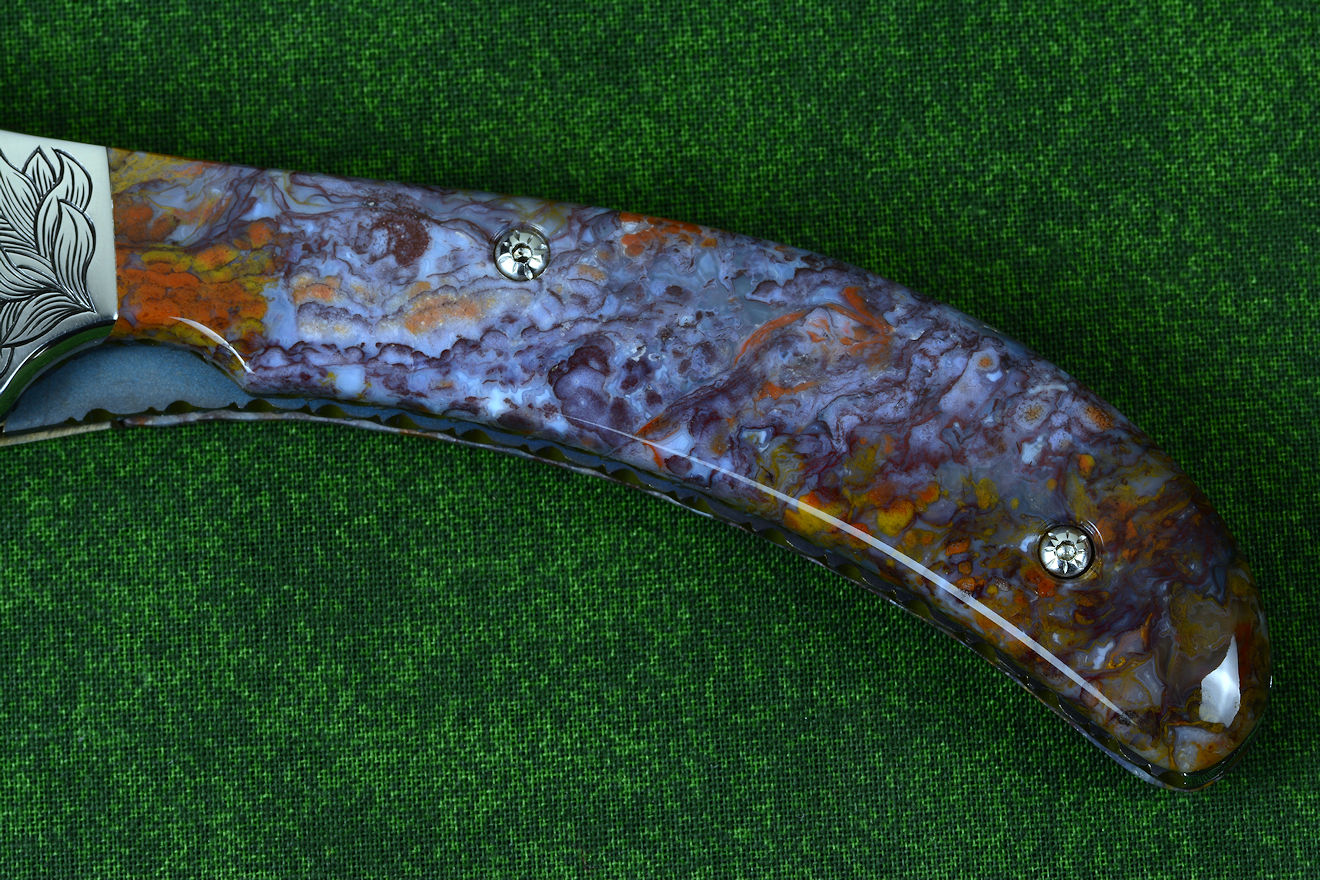 • In nature's most eternal and durable material, stone, the handle scales of this knife are hard and tough Rio Grande Agate, a fine-grained chalcedony gemstone. This is a stone that I found on my rock hounding treks through the badlands of west-central New Mexico, near Ladron mountain in Socorro County. Because it was a personal find in a remote area, it's unlikely I'll ever see any of this again, once my stock runs out. This agate takes a high vitreous polish with purples, maroons, oranges, and some white agate inclusions. Like many of the gemstones I use, this is a handle that is more fascinating the closer and more intensely it's scrutinized; see the enlargements below. It requires zero care, maintaining the appearance indefinitely.