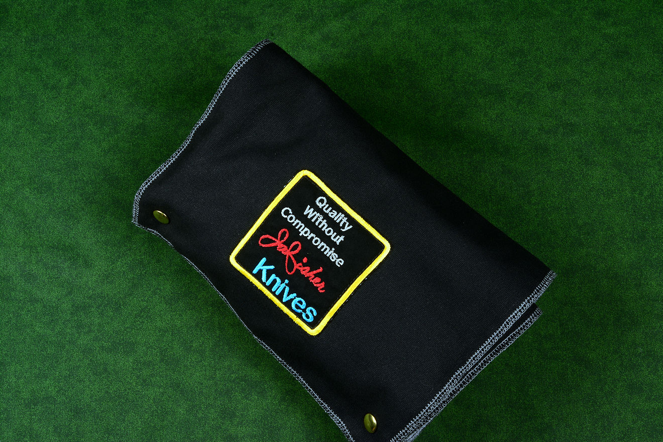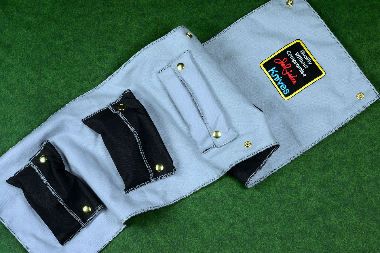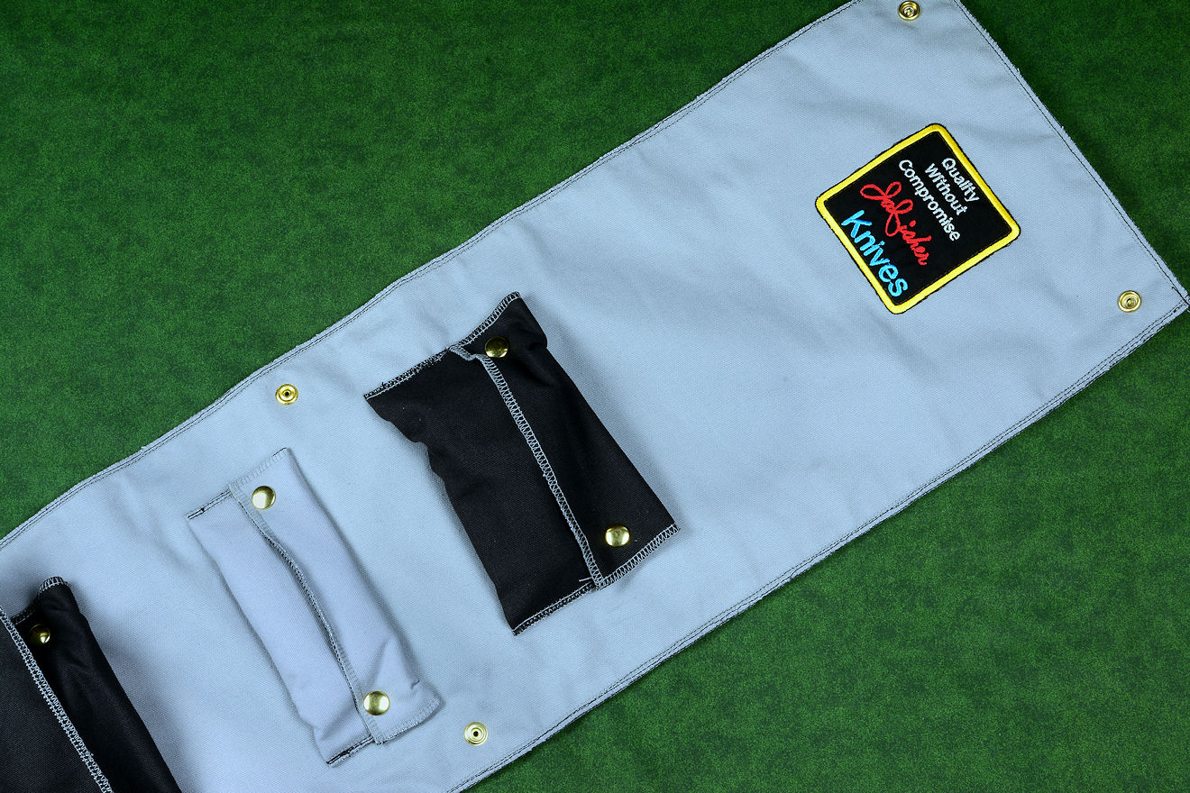 • Roll: Welcome to my new roll! My client didn't request a stand or hard case, but he still needs a home for everything, so I created this new roll design. The material is all cotton canvas duck, stitched with nylon and polyester heavy thread. I chose a black contrasting with gray for the colors. I made the central gray pocket, lined with polyester felt for the knife, and the black pockets are for the sheaths. The knife will be protected in the center of the roll layers. The edges are all overstitched to prevent unraveling, and each pocket has two independent layers. The knife and sheaths fit snugly inside, the knife pocket is lined with polyester felt, and all of the pockets are secured with brass plated steel dot snaps for security. I added my patches inside and out, and the body of the roll is triple layered. That way, the dot snaps and heavy stitching goes through two layers of the canvas, and is hidden by the third layer. This means that when in the roll, the sheaths are protected by five layers of cotton canvas duck and the knife by six layers (including the polyester felt)! I know I'll be making more of these, it just makes sense to complete the ensemble.